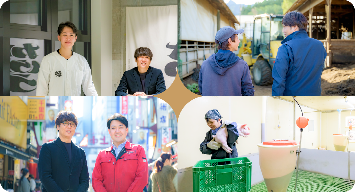 「まる豚」は、育てる人、運ぶ人、届ける人——たくさんの人の“輪”から生まれた名前です。私たちが大切に育てた豚が、人から人へ、お店へとつながって、“地元の自慢の味”になるように。そんな想いが込められています。